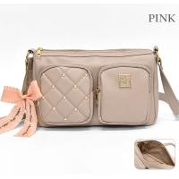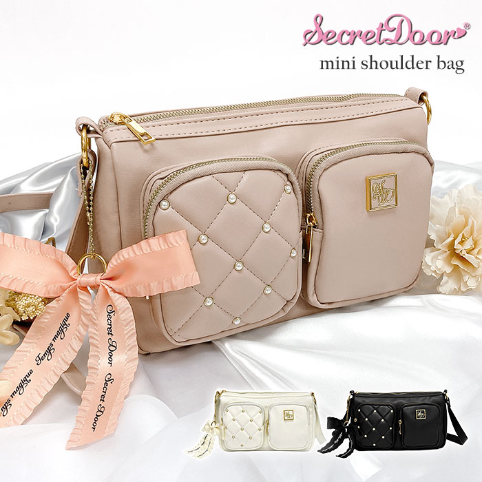 ■ パールが装飾されたキルティングとロゴプレート付きのポケットがポイントのミニショルダーバッグです。