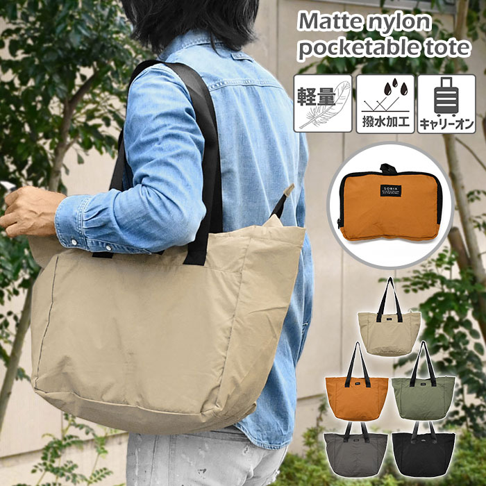 マットナイロン ポケッタブルトート メンズ トートバッグ キャリーオン エコバッグ 折りたたみ 折り畳み トラベル 旅行 大容量 撥水 おしゃれ 大人 ナイロン