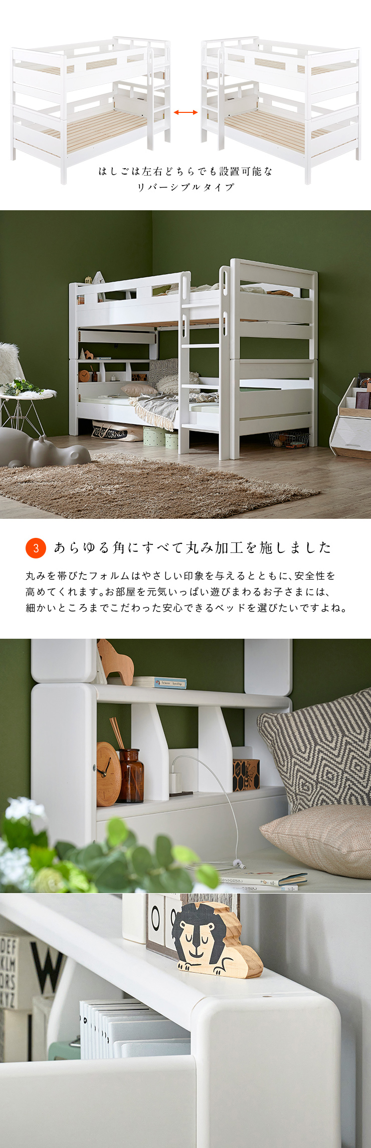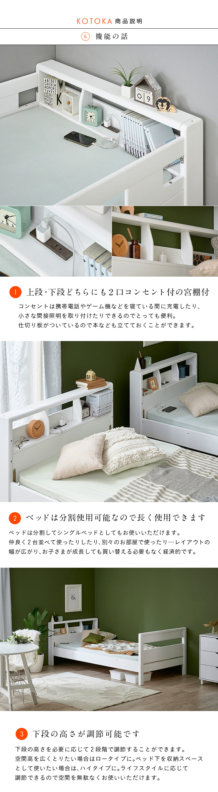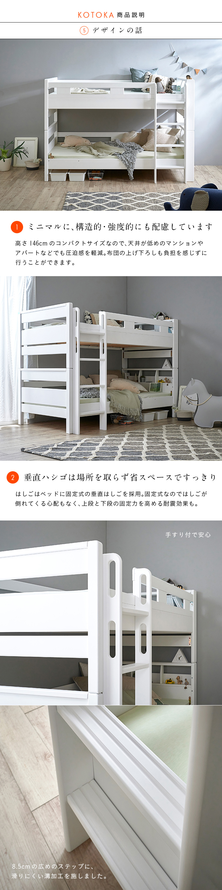 5年保証 耐荷重700kg 国産 二段ベッド 2段ベッド 二段ベット 2段ベット 子供 大人用 檜 ひのき 宮付き おしゃれ KOTOKA(コトカ) ホワイト