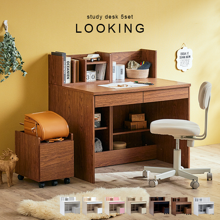 コンパクト 学習机 学習デスク シンプル 勉強机 収納 木製 システムデスク 子供 おしゃれ デスク収納 白 幅100cm 5点セット LOOKING3(ルッキング3) 7色対応