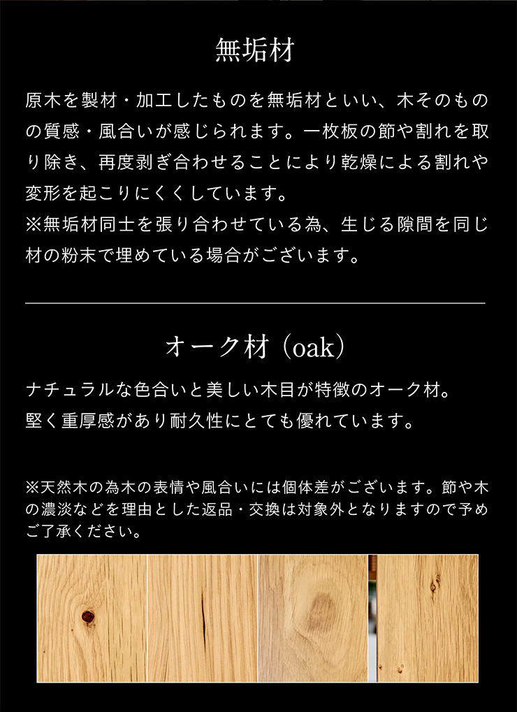 ※天然木の為木の表情や風合いには個体差がございます。節や木の濃淡などを理由とした返品・交換は対象外となりますので予めご了承ください。