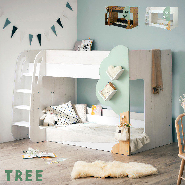 二段ベッド 大人用 子供 ツリー型のディスプレイラック付き 2段ベッド おしゃれ 子ども ロータイプ ローベッド 木製 低め TREE(ツリー) 2色対応