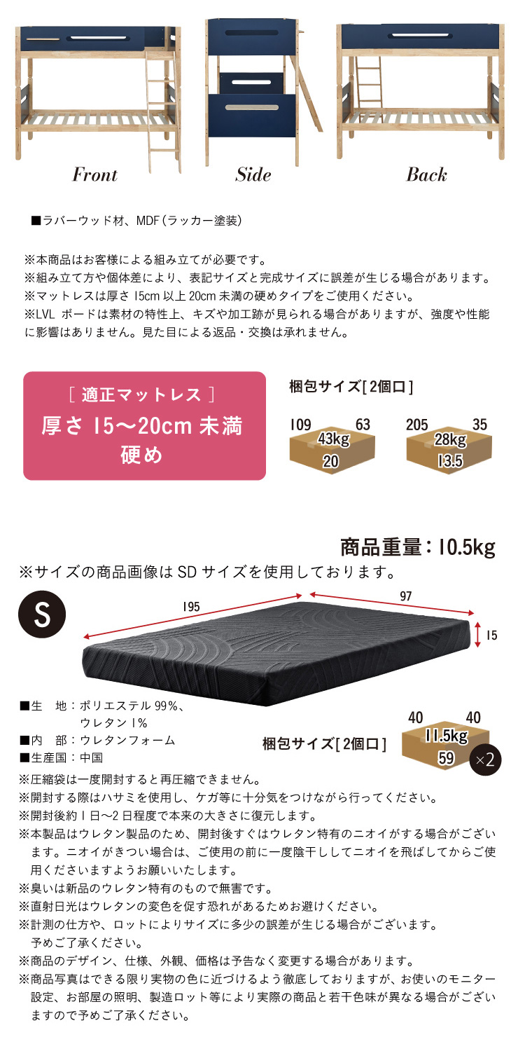マットレス:約W97 x D195 x H15cm(10.5kg)