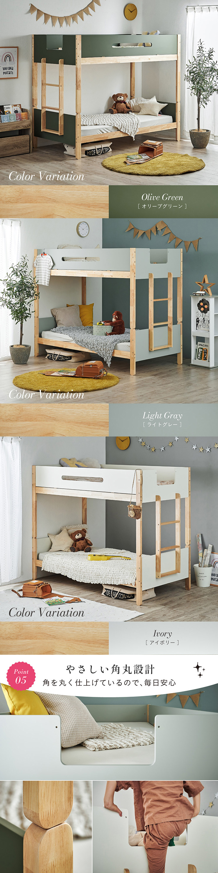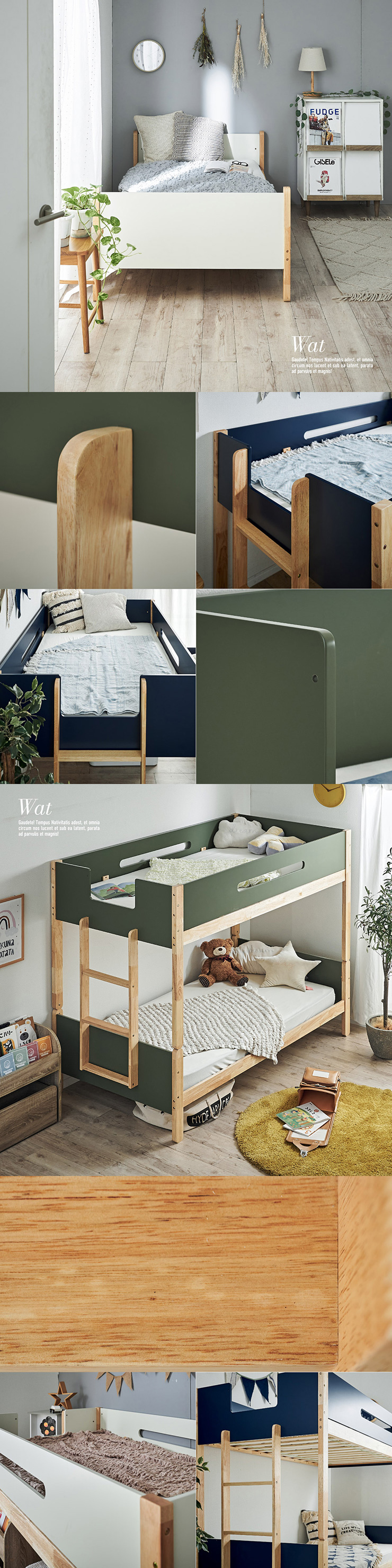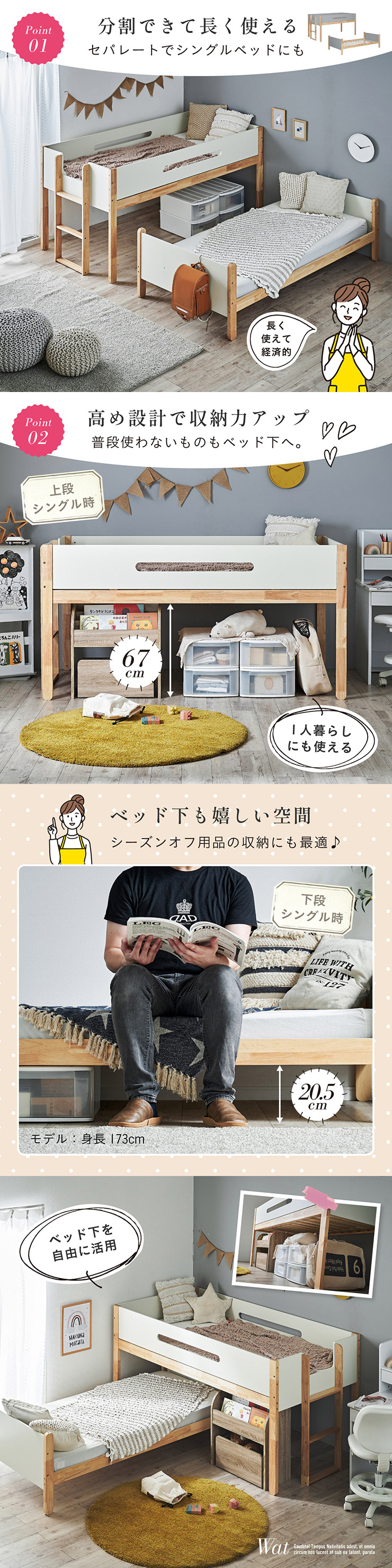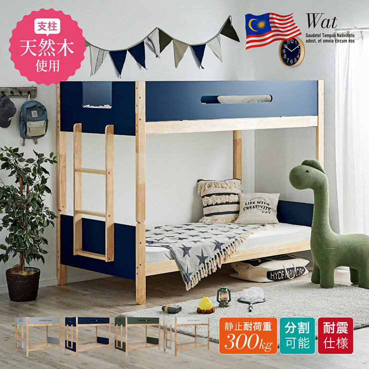 二段ベッド 大人用 子供 分割可能 木製 天然木 耐震仕様 おしゃれ Wat(ワット) 4色対応 収納付き 高さ調整 シングル はしご付き コンパクト シンプル 子供部屋