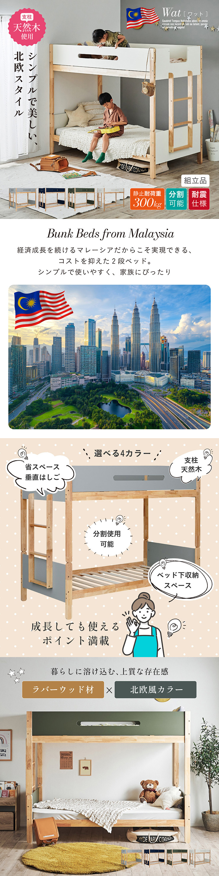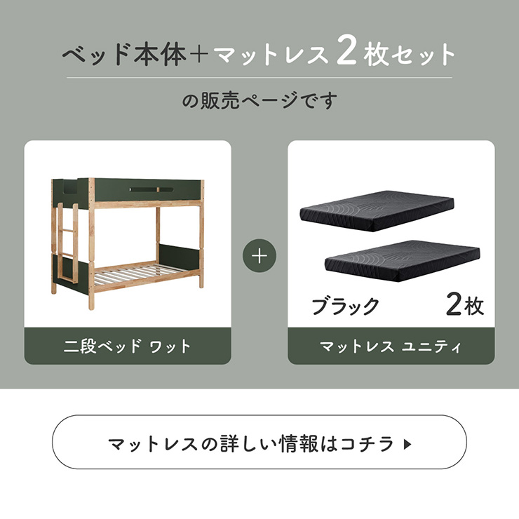 二段ベッド 大人用 子供 分離 マットレス シングル 硬め おしゃれ シングルベッド マットレス付 2枚 BKセット Wat ワット + Unity ユニティ 4色対応