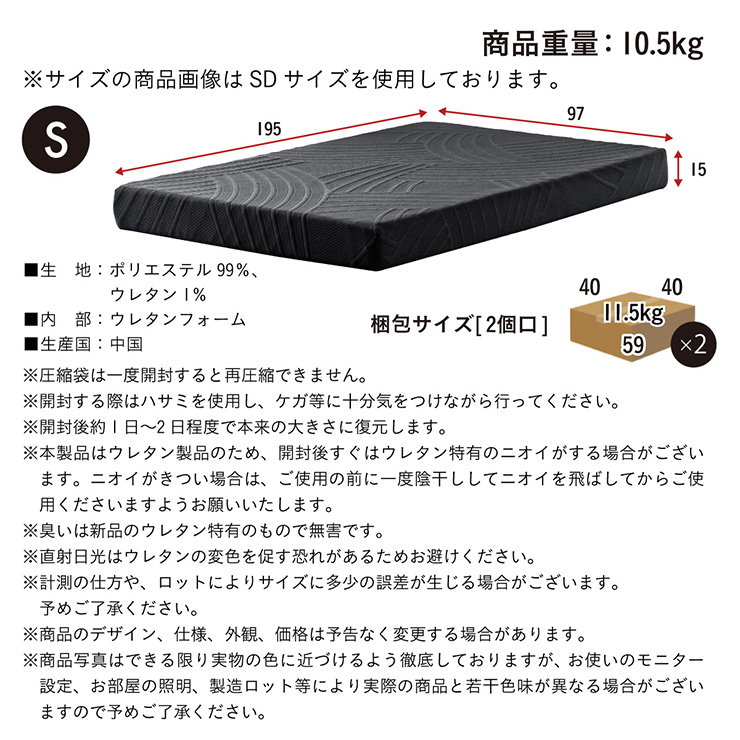 マットレス:約W97 x D195 x H15cm(10.5kg)