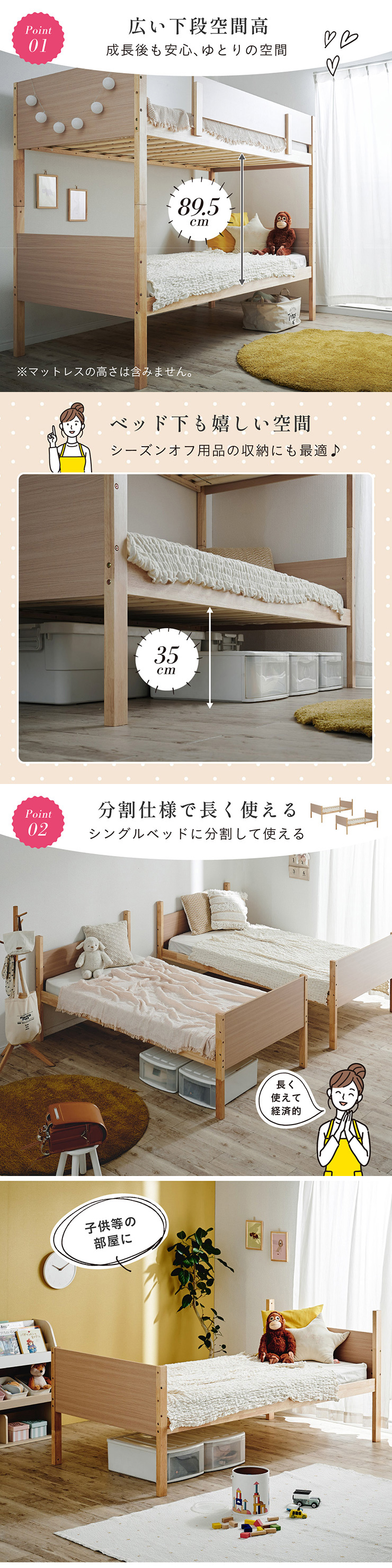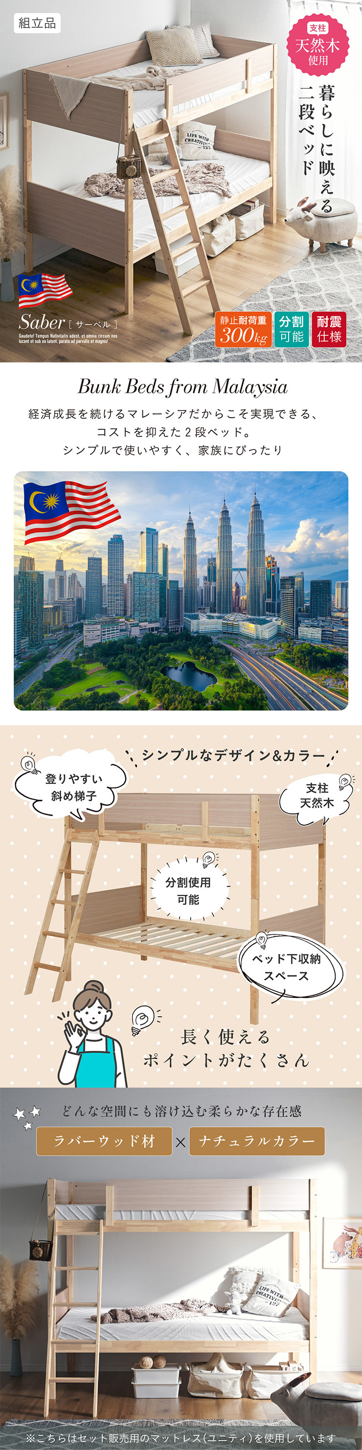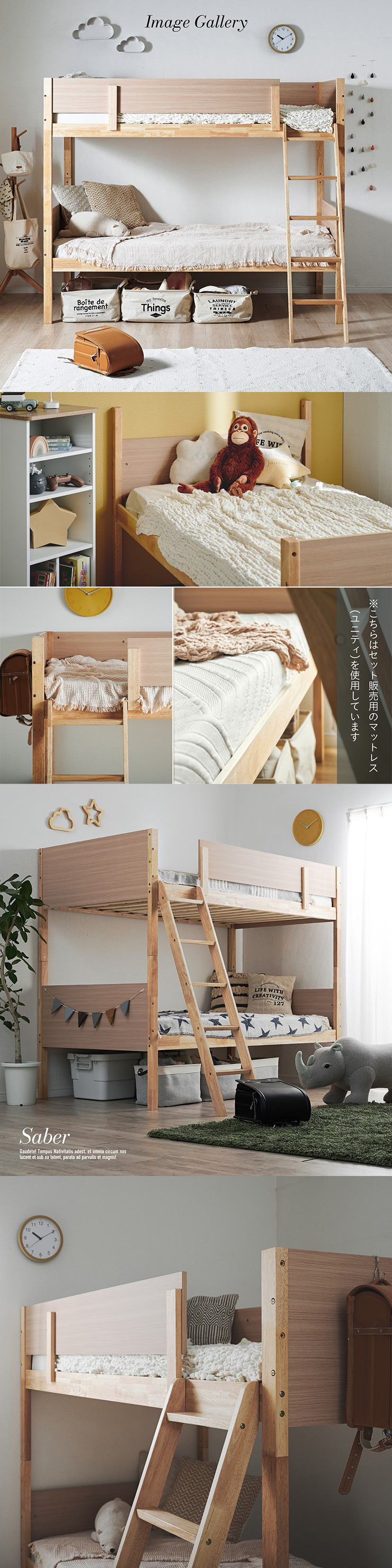 二段ベッド 大人用 子供 分割可能 シングルベッド マットレス 2枚セット すのこ 敷布団 子供用 おしゃれ 子供部屋 Saber(サーベル)+Unity(ユニティ)