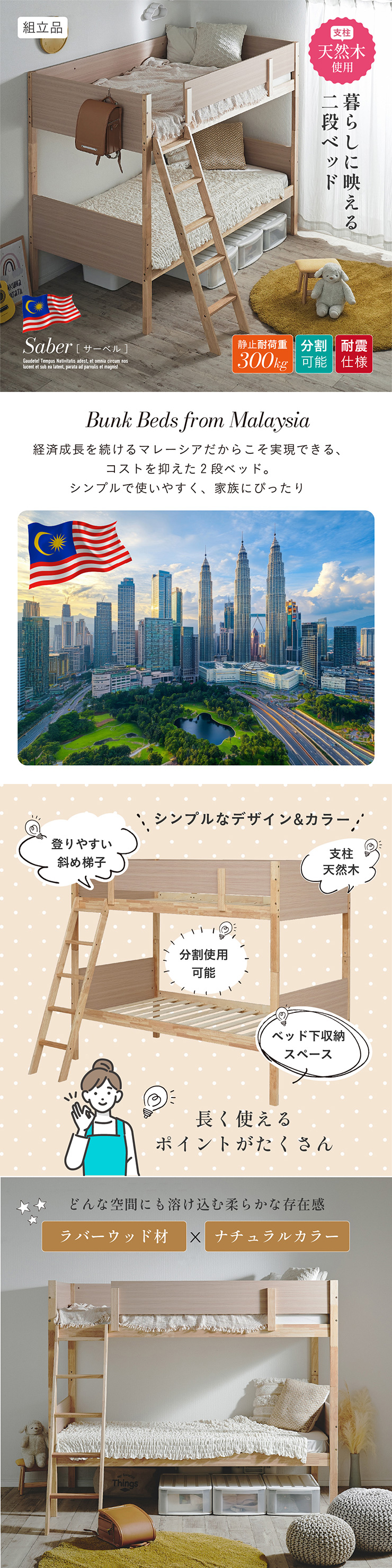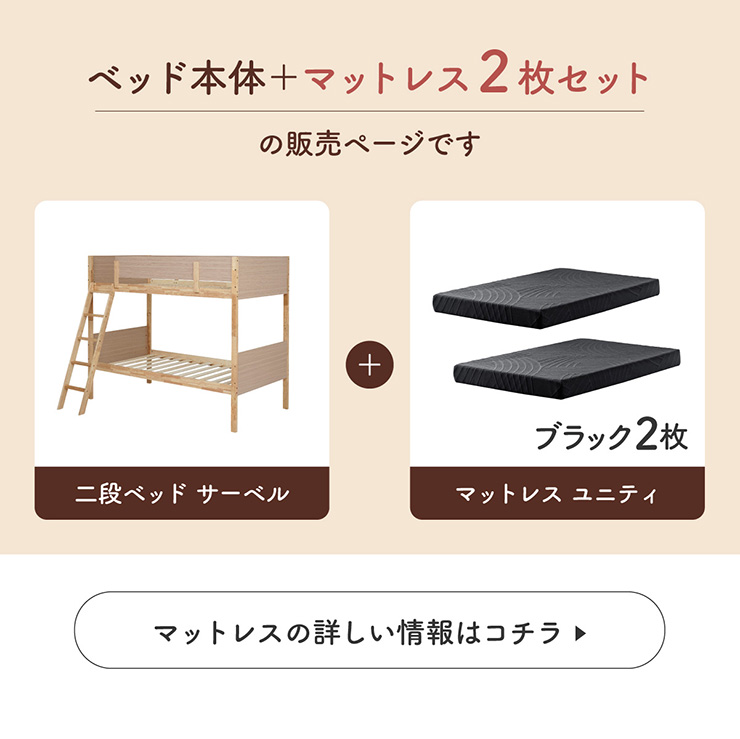 二段ベッド 大人用 子供 分離 マットレス付 シングル 硬め おしゃれ シングルベッド すのこ 収納 2枚 BKセット Saber サーベル + Unity ユニティ