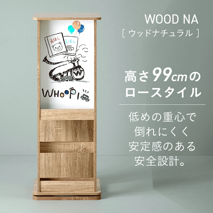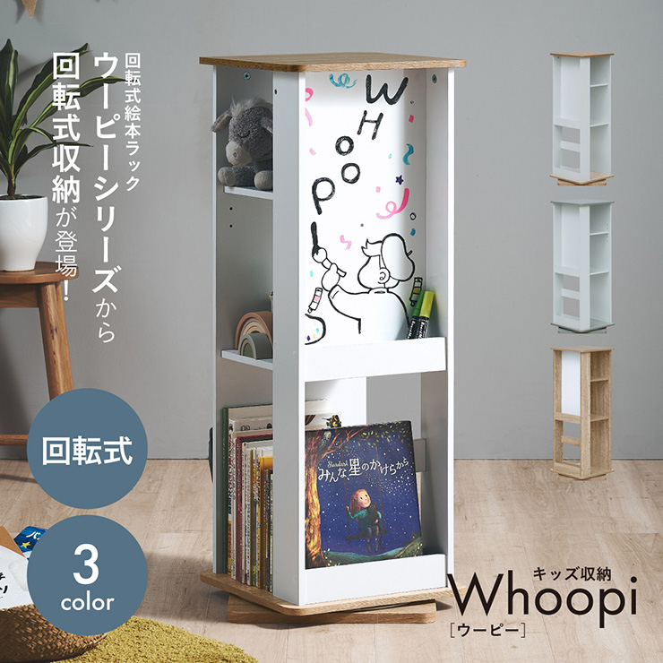 キッズ収納 回転式 本棚 Whoopi(ウーピー) 3色対応 360度回転 スリム 絵本ラック 教科書 A4収納 おしゃれ リビング 木製 おしゃれ ホワイトボード フック付き