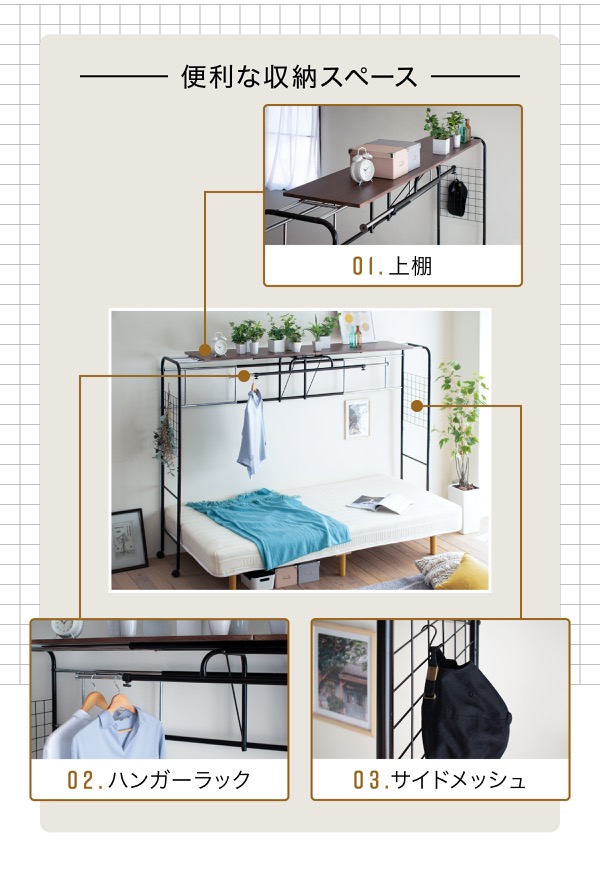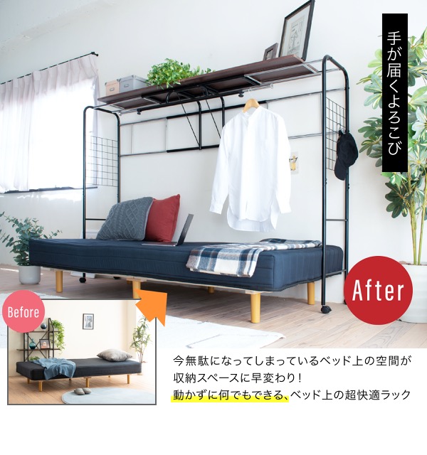 収納棚 ラック ハンガーラック 後付け オプション 汎用 上棚 伸縮 キャスター付き シングル セミダブル ダブル スリム シンプル 追加棚 ベッドラック UNI-0001
