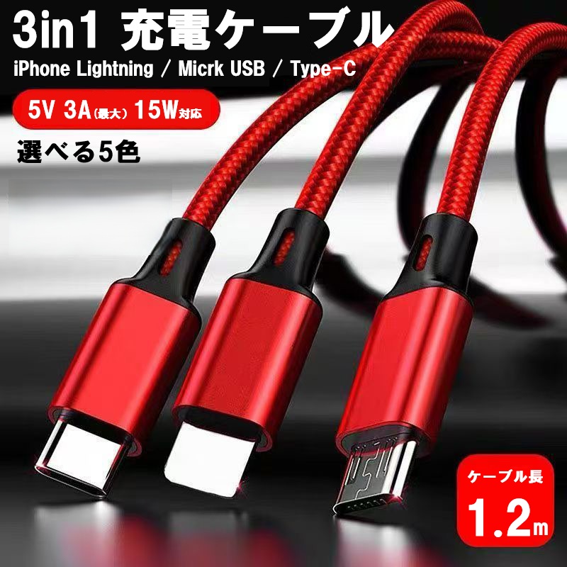 3in1充電ケーブル 5V 3A 15W対応 3本購入毎に1本おまけ iPhone Android micro USB Type-C USBケーブル モバイルバッテリー 充電器 ポイント消化 ポイント利用 8