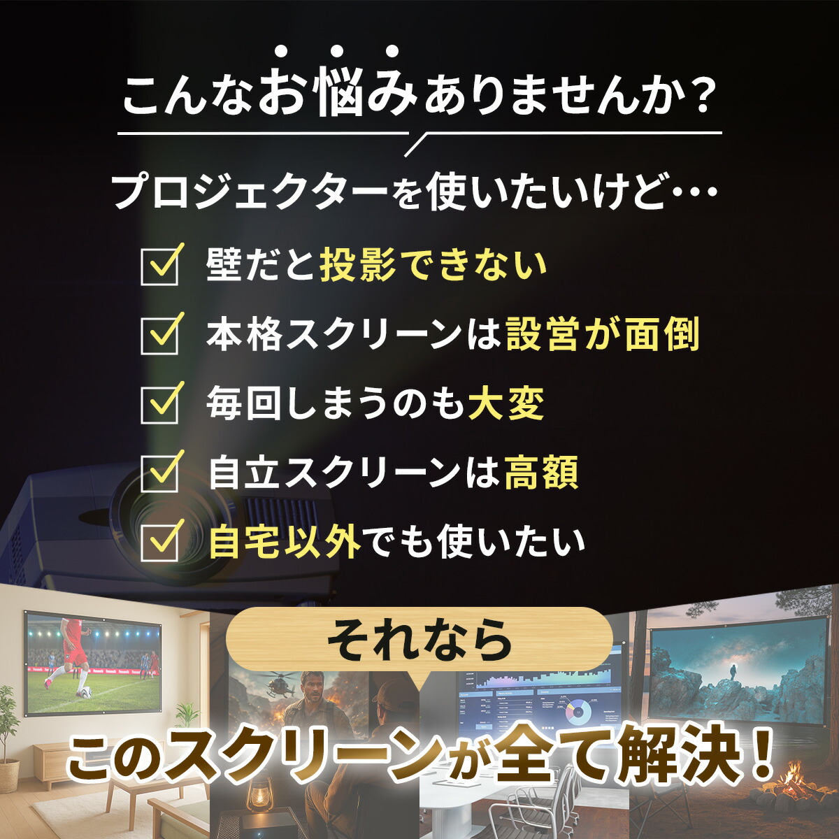 ホームシアター/アウトドア映画/オフィスの会議室/学校の教室/店舗の映像演出/イベント・上映会など