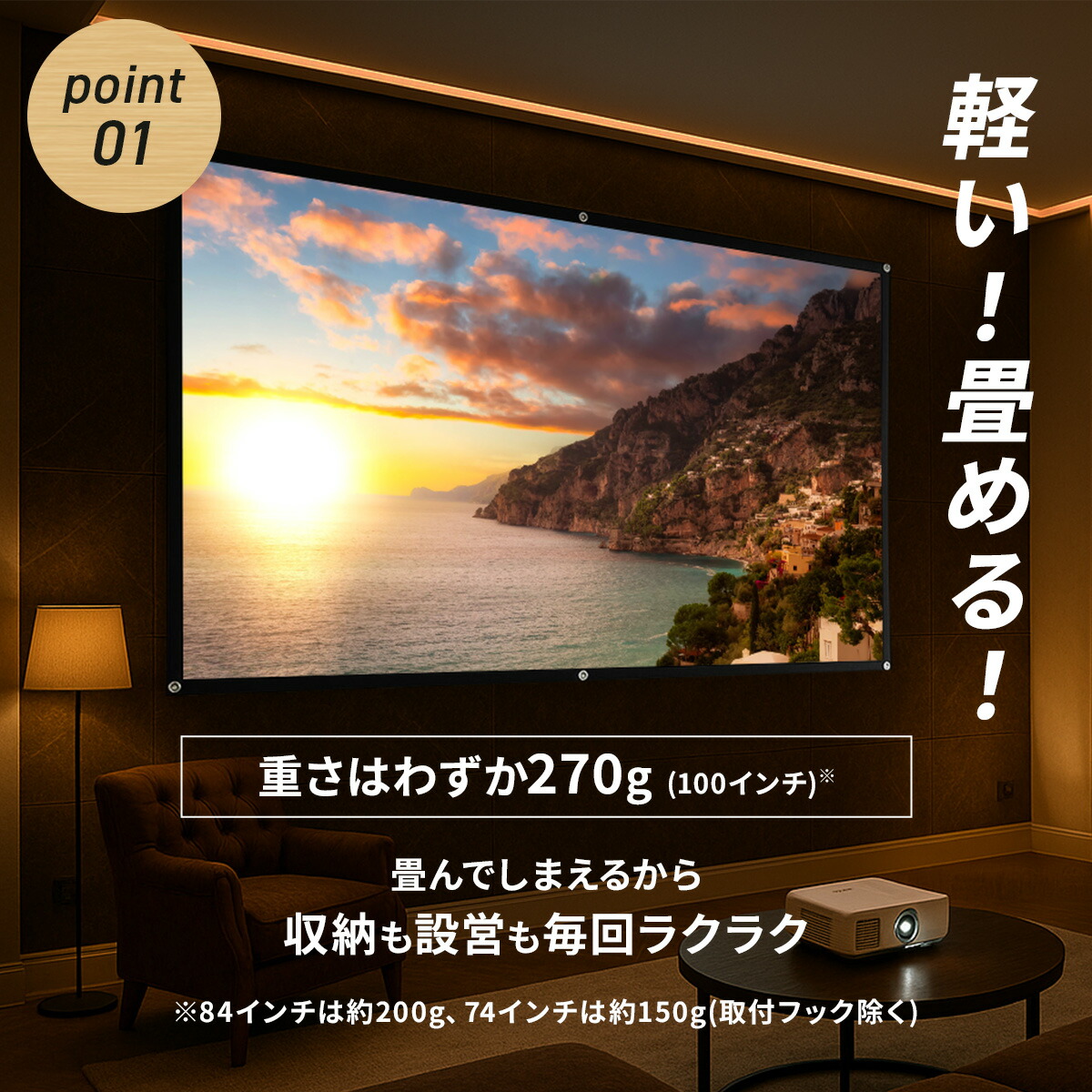 ● 選べる3サイズ(72・84・100インチ)でぴったりの大画面!