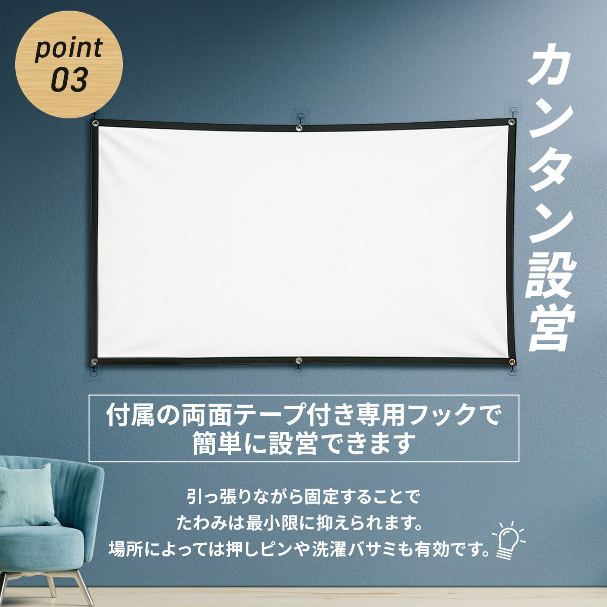 この吊り下げ式プロジェクタースクリーンがあれば、どこでも手軽にホームシアター空間が完成します。