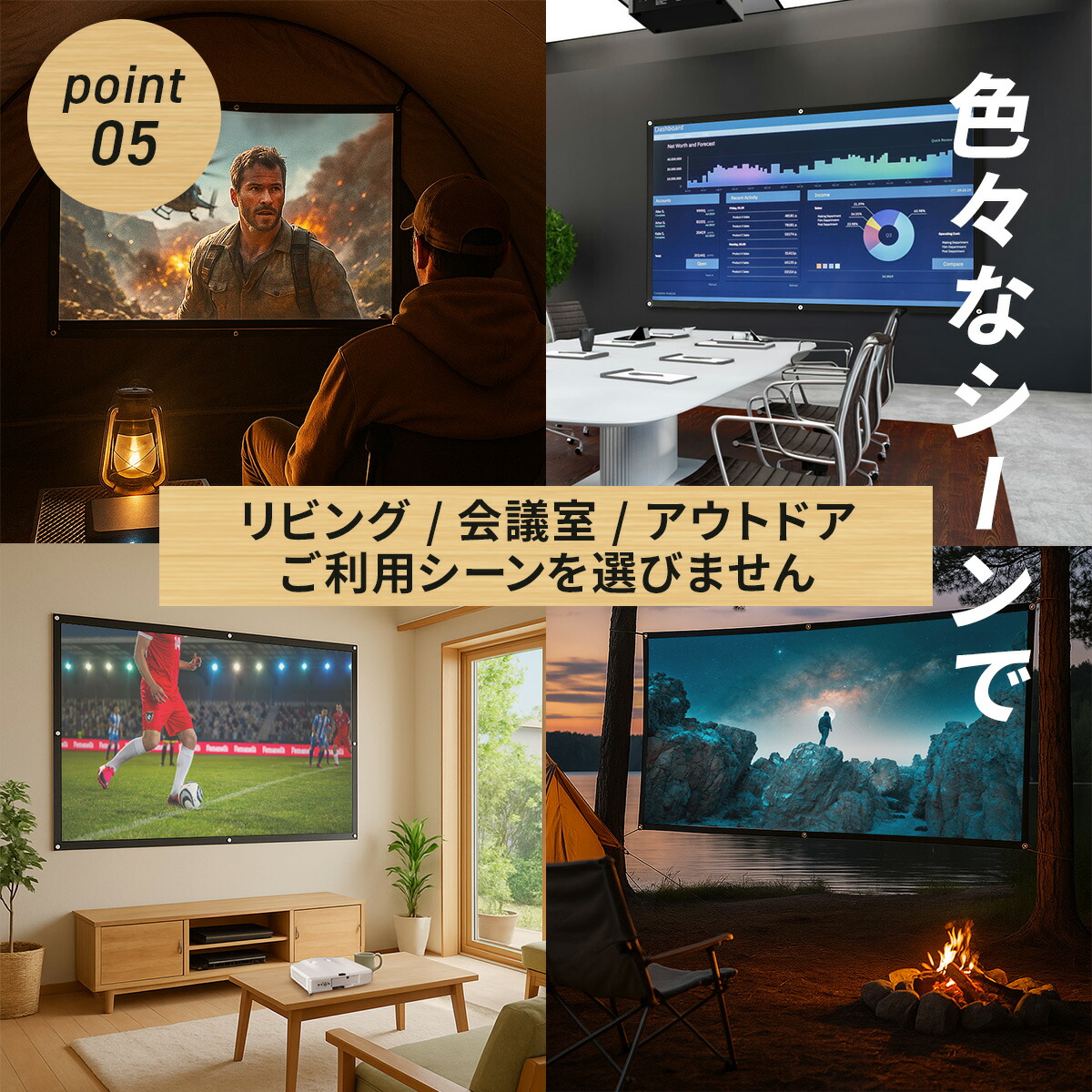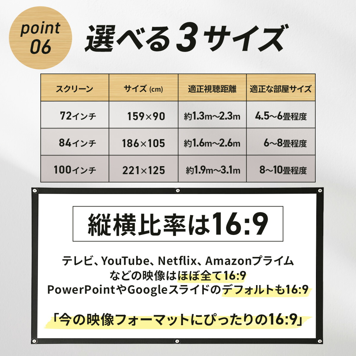映画・会議・学校行事・イベントなど、使い方に合わせて最適なサイズが見つかります。