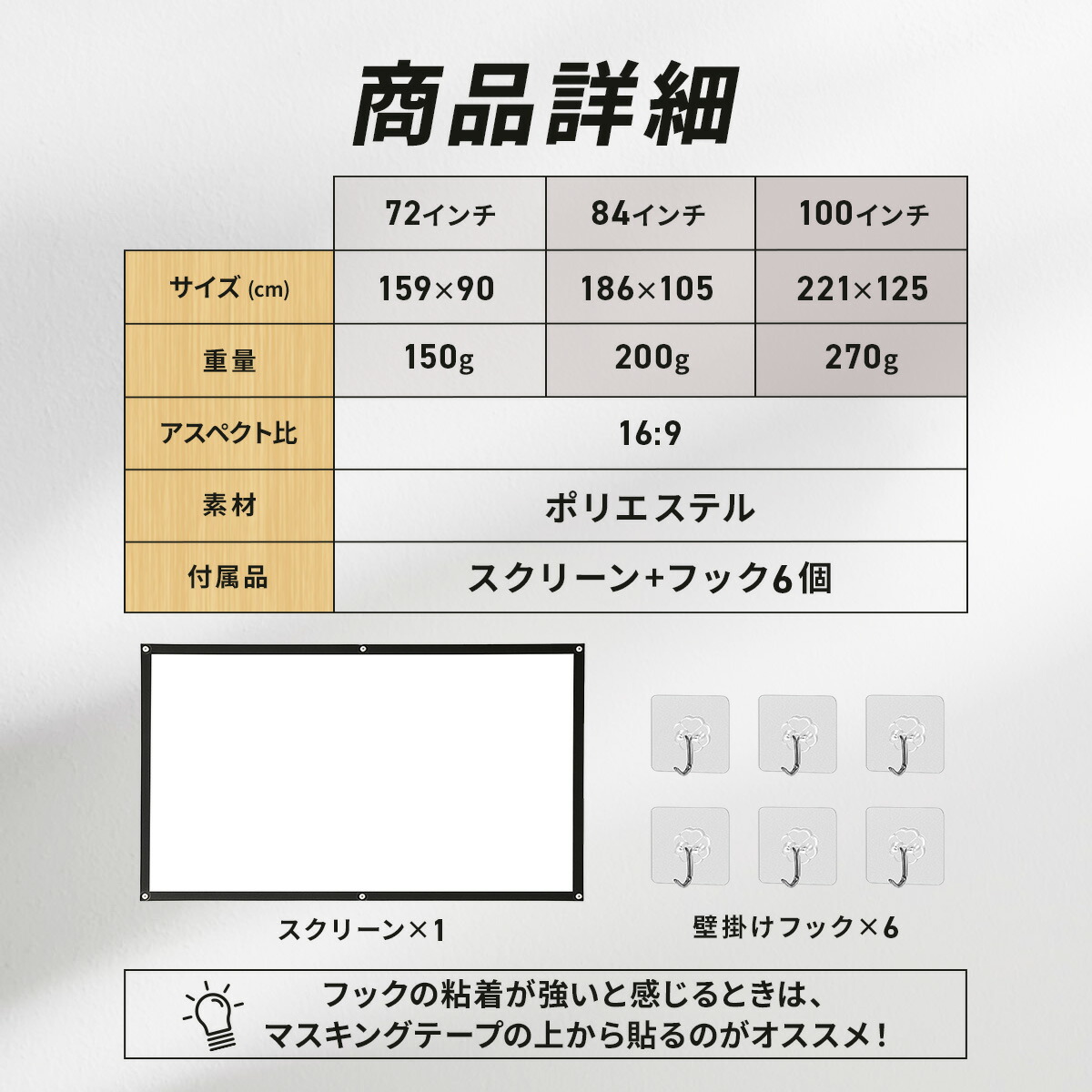 大画面で楽しむ!軽量&持ち運びOKの壁掛けタイプ(72・84・100インチ)