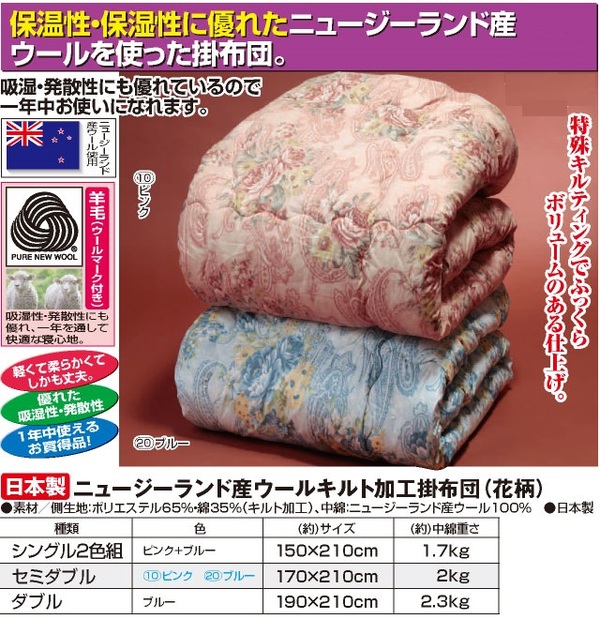 保温性・保湿性に優れたニュージーランド産ウールを使った掛け布団。