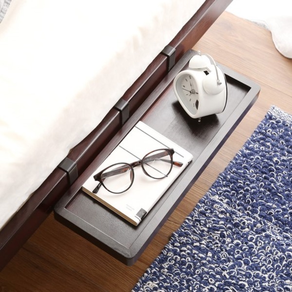 ベッドフレームに引っ掛けるだけの簡単取付。スマホなどの小物を置くのに便利なサイズで好きな位置に取り付け可能な簡易宮です。