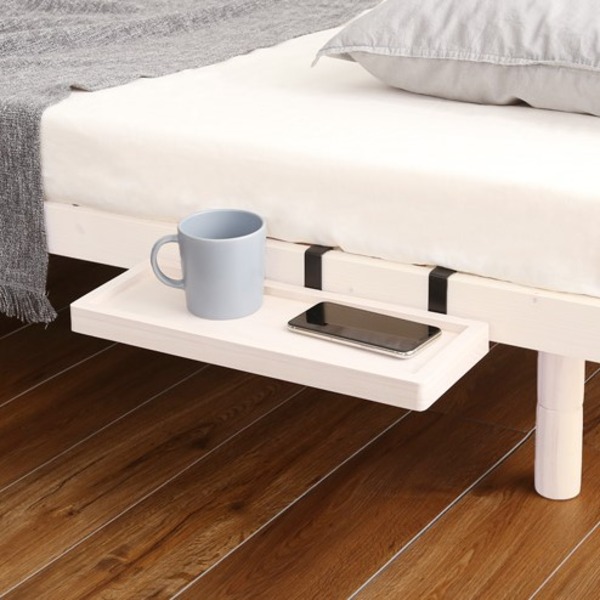 ベッドフレームに引っ掛けるだけの簡単取付。スマホなどの小物を置くのに便利なサイズで好きな位置に取り付け可能な簡易宮です。