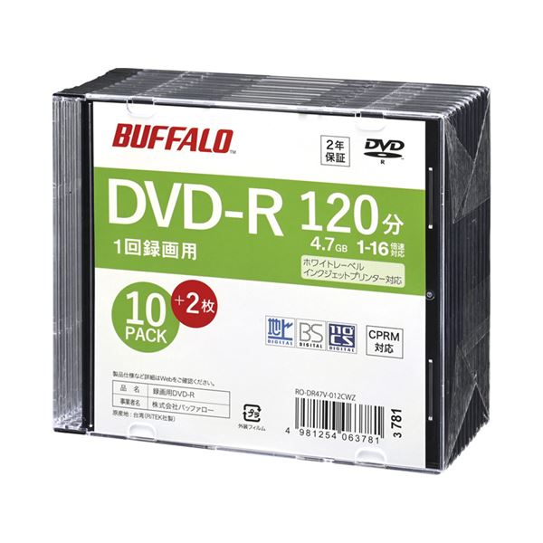 バッファロー 光学メディア DVD-R 録画用 120分 法人チャネル向け 10枚+2枚 RO-DR47V-012CWZ