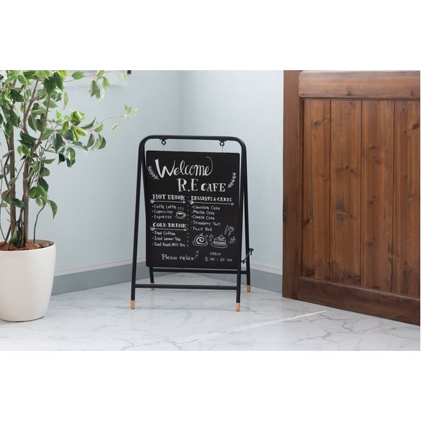 スチールフレームと木製の脚キャップの組み合わせでスタイリッシュな印象を与えるサインボード。
