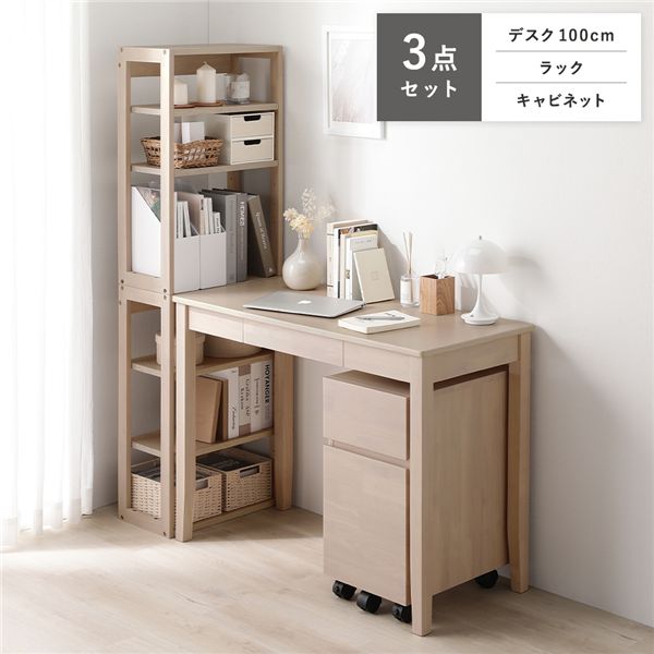 【商品名】 天然木 デスクシリーズ 3点セット デスク 100cm幅 + ラック + キャビネット ラテホワイト デスクセット 引出し付き 【ジャンル・特徴】 パソコン 机 学習机 ワークデスク PCデスク 勉強机 学習デスク パソコン机 仕事机 勉強デスク PC机 収納ラック 収納家具 オープンラック リビング収納 オープンシェルフ 収納ワゴン 袖机 サイドラック デスクワゴン サイドワゴン 書斎 子供部屋 勉強部屋 在宅ワーク
