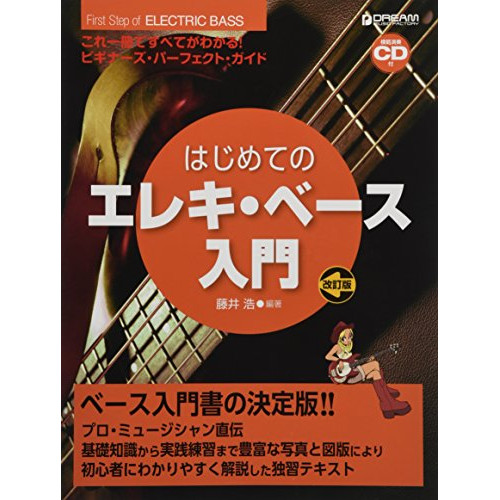 はじめてのエレキ・ベース入門(模範演奏CD付)(改訂版)1 . ベースについて/2 . ベースの種類/3 . ベース各部の名称と役割/4 . 演奏フォーム/5 . 弦の交換/6 . チューニング/7 . 基本的な弾き方/8 . アンプを使って音を出してみよう/9 . 弦の押さえ方/10 . ツー・フィンガーで弾いてみよう/11 . ピックで弾いてみよう/12 . 楽譜の基礎知識/13 . タブ譜の見方/14 . 楽譜が読めると楽しくなる!/15 . フレーズを使った基礎練習/16 . リズム強化トレーニング・フレーズ集/17 . 左手の強化トレーニング・フレーズ集/18 . ベーシストの基礎理論/19 . 音階(ドレミ~)のフォーム/20 . コードと度数について/21 . ベース・ラインのしくみ/22 . テクニックを覚えよう/23 . ハンマリング・オン&プリング・オフ/24 . スライド&グリッサンド/25 . ビブラート/26 . ハーモニクス奏法/27