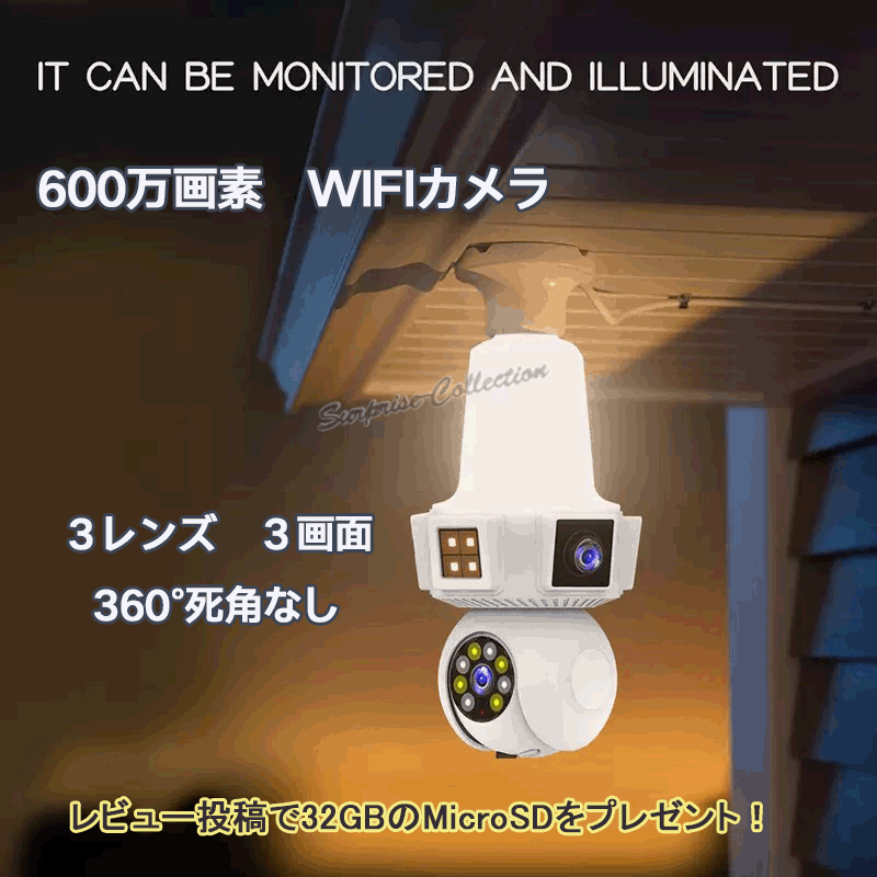 機能:LED電球型防犯カメラ/3レンズ/3画面/600万画素/360度視野/双方向音声/128GB対応/人体検知