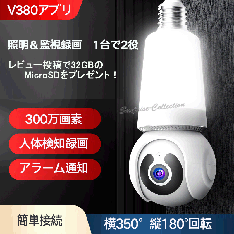 機能:LED電球型防犯カメラ/300万画素/360度視野/双方向音声/128GB対応/動体検知