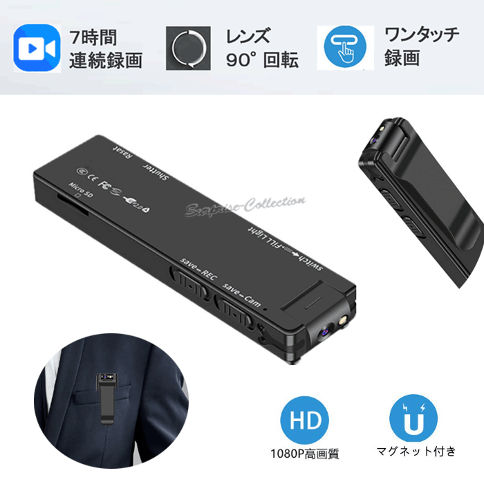 | 機能 | 録画、録音、静止画、レンズ90度回転、動体検知、PCカメラ、USBメモリ、ボイスレコーダー、長時間録画、ワンタッチ録画 |