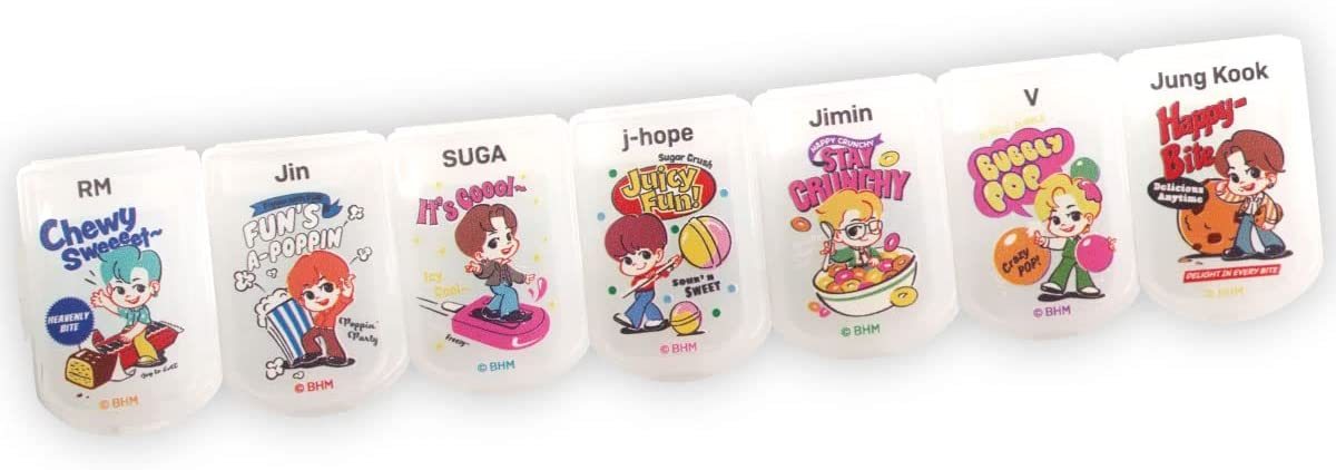 JUNGKOOK・V・JIMIN・JIN・SUGA・RM・J-HOPEの7種類の柄がかわいいピルケースに一週間分のお薬をいれて持ち歩くことができます♪