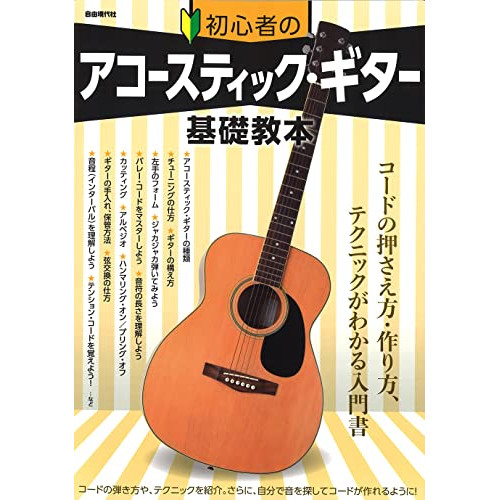 初心者のアコースティック・ギター基礎教本1 . ◆Chapter 1 ギターを持とう!/2 . ○STEP 1 ギターの種類/3 . アコースティック・ギター(アコギ)/4 . アコースティック・ギターの種類/5 . エレキ・ギターとの違い/6 . ○STEP 2 チューニングの仕方/7 . チューナー/8 . チューニングしてみよう/9 . ○STEP 3 ギターの構え方/10 . 座ったときの構え方/11 . 立ったときの構え方/12 . ◆Chapter 2 ギターを弾いてみよう/13 . ○STEP 4 左手のフォーム/14 . クラシック・フォーム/15 . ロック・フォーム/16 . ○STEP 5 コードを押さえよう/17 . ロー・コードを弾こう/18 . ○STEP 6 ジャカジャカ弾いてみよう/19 . ピックの持ち方/20 . ストロークをしよう!/21 . ○STEP 7 コード進行を弾いてみよう/22 . コード・チェンジ/23 . ○STEP 8 バレー・コードをマスターしよう/24 . バレー・コード
