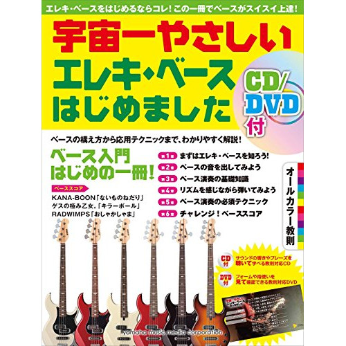 宇宙一やさしい エレキ・ベースはじめました(CD&DVD付)1 . ■コンテンツ/2 . 第1章 まずはエレキ・ベースを知ろう!/3 . 1、ベースの各部名称/4 . 2、ピックアップの種類/5 . 3、ネックのスケール/6 . 4、パッシブ・ベースとアクティブ・ベース/7 . 5、ベースの一般的なコントロール部/8 . 6、ベースの種類/9 . 7、ベースと一緒に用意しよう/10 . 8、正しい音にチューニングしよう/11 . 9、弦を交換しよう/12 . 第2章 ベースの音を出してみよう/13 . 10、ベースとアンプのつなぎ方/14 . 11、アンプのコントロール/15 . 12、ベースの構え方/16 . 13、楽譜の読み方/17 . 14、音符と知ろう/18 . 15、小節と拍子を知ろう/19 . 16、くり返し記号/20 . 第3章 ベース演奏の基礎知識/21 . 17、基本フォームを覚えよう/22 . 18、左手フォームを確かなものにするエクササイズ/23 . 19