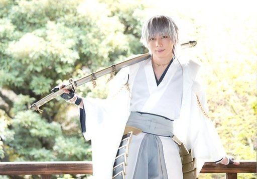 商品名:中古生写真(男性) 染谷俊之(鶴丸国永)/横型・膝上・衣装白・腰掛・刀担ぎ・キャラクターショット/舞台「刀剣乱舞」トレーディングブロマイド