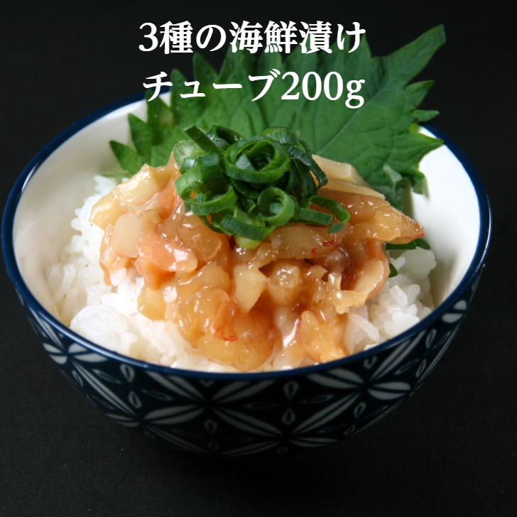 これだけで豪華海鮮丼に!3種類の海鮮漬けチューブ 200g 生食用 4〜5人前解凍するだけ サーモン イカ 赤海老 寿司 ご飯のお供 丼 寿司 海の端っこ