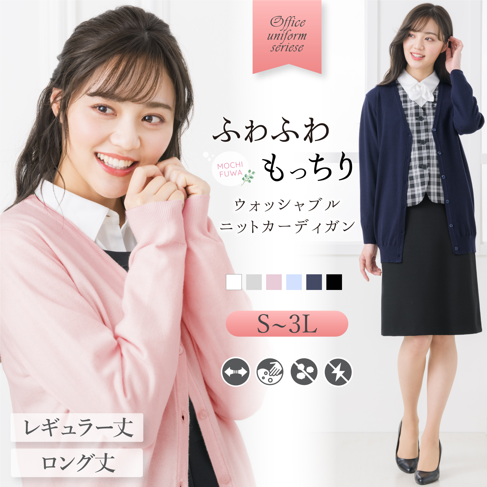 商品説明 | オフィス、企業制服、ナース(看護師)の方にもおすすめな優しい着用感のカーディガンです。 ふわふわもっちりで、やみつきになる肌ざわり。 オールシーズン着用しやすい軽やかな着心地です。 毎日着るものだから、ご家庭で手洗いのお洗濯ができます。 毛玉を気にせず、お手入れが簡単なカーディガン。 なめらかなタッチでチクチクしないので快適にご着用いただけます。 また、静電気防止でいや〜なパチパチを防止します。 制服の襟との相性を考慮しVネックは深め、かつ袖をまくる事が多い事を想定して、 袖がずれにくいようにするためにリブ幅が広めでフィットしやすいデザイン。 オフィスや企業、医療現場での着用もおすすめです。 丈は、腰丈までのレギュラー丈と腰がすっぽり隠れるロング丈の2種類からお選びいただけます。 |