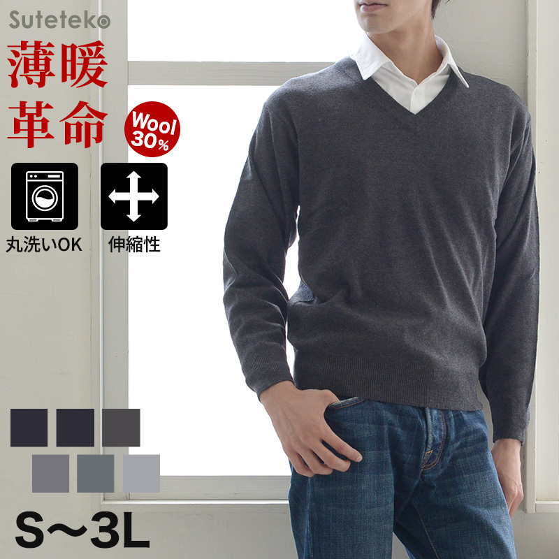 Sutetekoからメンズ用の薄手無地V首(Vネック)ニットセーターです。