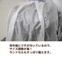 リュックやランドセルの上から着用可能な、ゆったりサイズの背中マチ付きデザインのランドコートです。