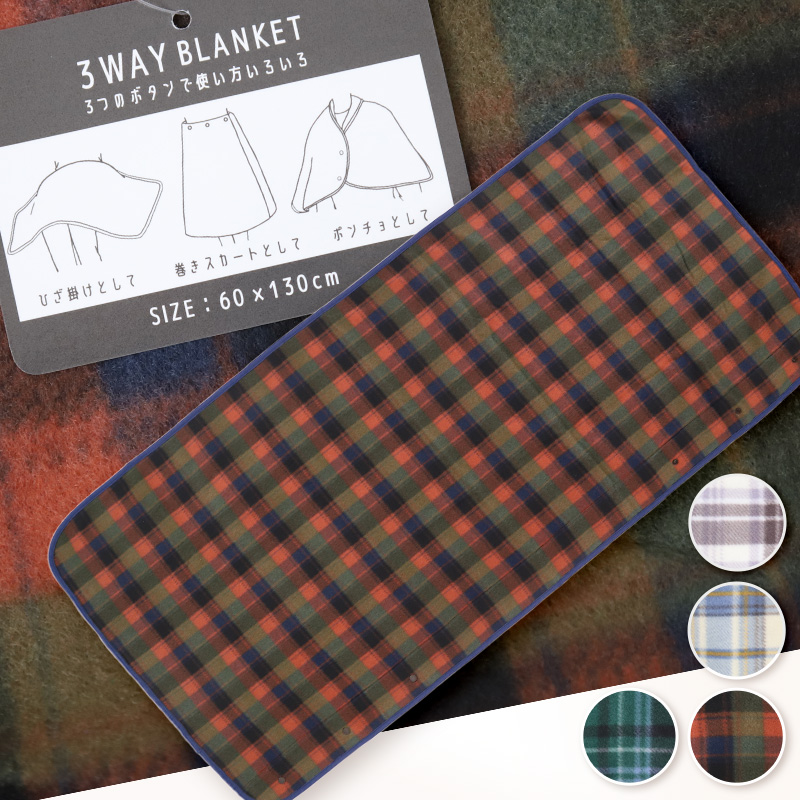 3つのスナップボタンで「 ひざ掛け 」や「 巻きスカート 」、「 ポンチョ 」としてもお使いいただけます。