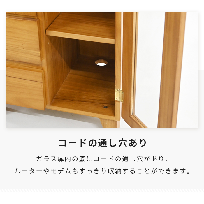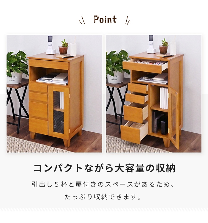 | 天然木を使用した高級感のある木製キャビネット。 コンパクトながら引出し5杯と扉付き収納スペースを備えた、収納力の高い設計。 ガラス扉内の底面にはコード通し穴を設けており、ルーターやモデムなどの機器をすっきり収納できます。 ガラス扉内には仕切り板1枚付き。収納物に合わせて3段階の高さ調節が可能。 引出しには軽くて扱いやすい桐材を使用。出し入れもスムーズで日常使いに便利。 脚のみ取り付けの簡単組立で届いたらすぐに使用いただけます。 明るい色合いの天然木が、お部屋をナチュラルでやさしい雰囲気に演出。 |