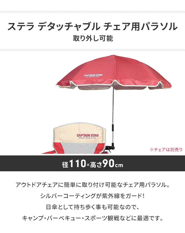 | 取付け・取外し簡単ワンタッチのチェア用パラソルです。 キャンプ・バーベキュー・釣り・スポーツ観戦に最適。 フレームは丸でも角でもOK! シルバーコーティングが紫外線をガードします。 ※チェアは別売りです。 |