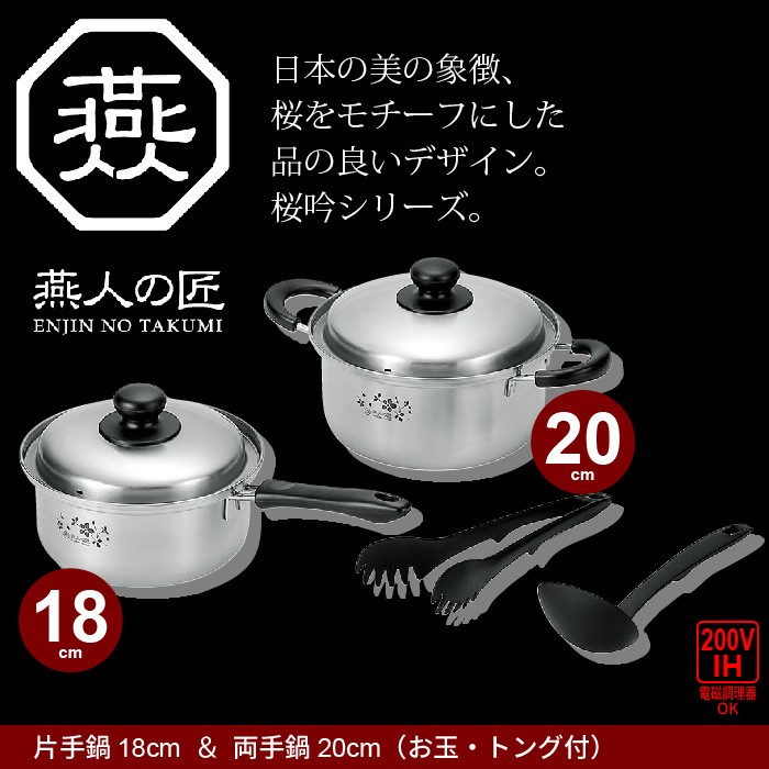 | 燕人の匠シリーズ 日本の美の象徴、桜をモチーフにした桜吟シリーズ。 料理の時の必需品!いくつあっても困らない、IH対応の片手鍋&両手鍋、お玉・トングセット。 機能本位のシンプルなデザイン。 野菜を茹でたり、ラーメンを作ったり、煮物、味噌汁など様々な用途でお使いいただけます。 電磁調理器、ガスコンロ、どちらでも使用可能。 お手入れしやすいステンレス製。 ステンレス加工で有名な新潟県燕市で製造。 一人暮らしや新生活をスタートする際にオススメのアイテムです。 | |