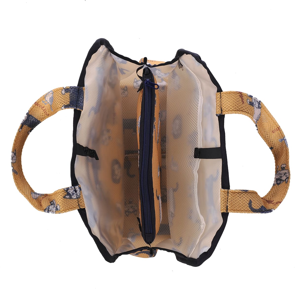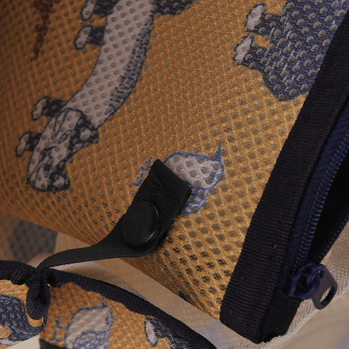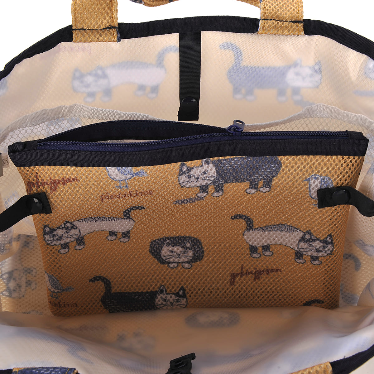 総柄プリントのバッグには、内側にメッシュのポケットや取り外しができるミニポーチ(タテ19cm x ヨコ25cm)が付いています。ロッカーキーや貴重品入れとしても使えます。