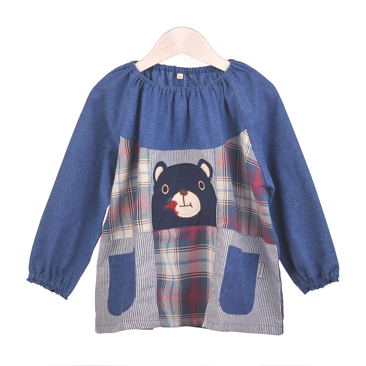 衿口ゴムで、ゆったりサイズのスモックです。フロントにポケットがあり、パッチワークの中におおきなくまさんの刺しゅうがついてかわいいですね。