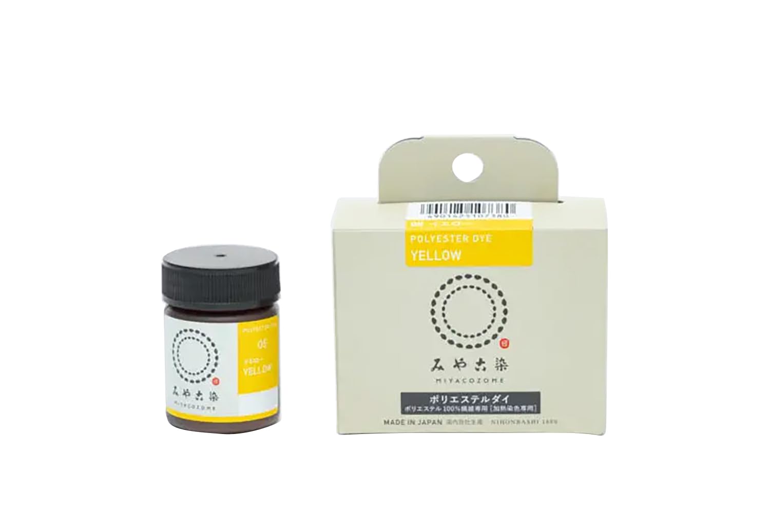 90℃程度の加熱染色をするだけで、ポリエステル100%繊維の染色が楽しめる染料です。従来のホットダイP-100とは違い、加熱ソーピング(加熱洗浄)が不要なため、染め方がずっと簡単になりました。全14色展開で、混色が自由にできます。さらに、ブラウスやスカートなどの衣類だけでなく、ボタンやウィッグもポリエステル100%であれば染色可能です。【ポリエステルの染め方】(1)染色容器とは別の耐熱容器に染料を入れ、熱湯0.5~1リットルでよく溶かす。(2)染める物がゆったり動かせるくらいの染色容器に熱湯を約9~9.5リットル用意し、濃色促進剤1包と(1)の染料を加える。(3)汚れ・しみ・のり気を洗い落とした染めるものをぬれたまま広げて入れ、火にかけ、かき混ぜながら約30分、90℃程度の加熱染色をする。(4)染めた温度より低い温度のお湯の中に放置して冷ました後、お湯で軽く洗う。中性洗剤を入れてさらに軽く洗い、水ですすいでから、かげ干しをする。ポリエステルダイは、有害指定化学物質を含まない、肌と環境にやさしいECO染料です。ECO染料は、ご家庭で安全、安心にお使いいただけるよう、原料を厳選し2005年より発売しております。生産も一貫して日本国内の自社工場でのみ行っており、染料の安全性には自身を持っております。また、環境に配慮し、外箱は再生紙を利用しました。・ご注意加熱染色のため、耐熱容器をお使いください。染料については白生地を基にした説明です。色生地を染色する場合は染め上がりの色は異なります。保管する際は、高温・多湿を避けてください。吸湿による固化が見られても、使用時によく撹拌分散すれば効力に問題はありません。品番:10738仕様:染料色・柄:Col.05イエローセット内容:染料20g、濃色促進剤20g、染め方説明書染色方法:90℃程度の加熱染色(加熱ソーピングは不要)1箱で染められるもの:ポリエステルのブラウス1~2枚(約250g)用意するもの:耐熱容器2つ、ゴム手袋、菜箸(.co.jpより)