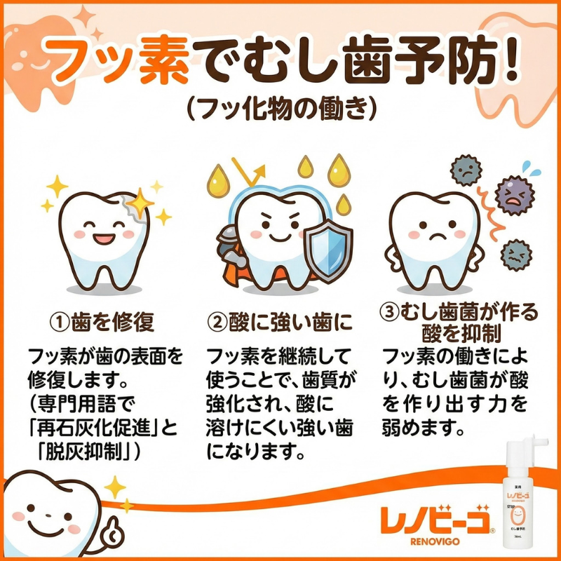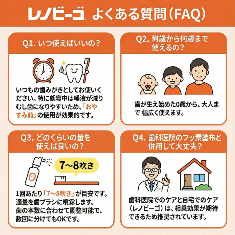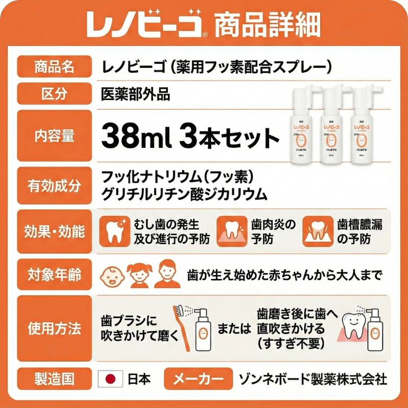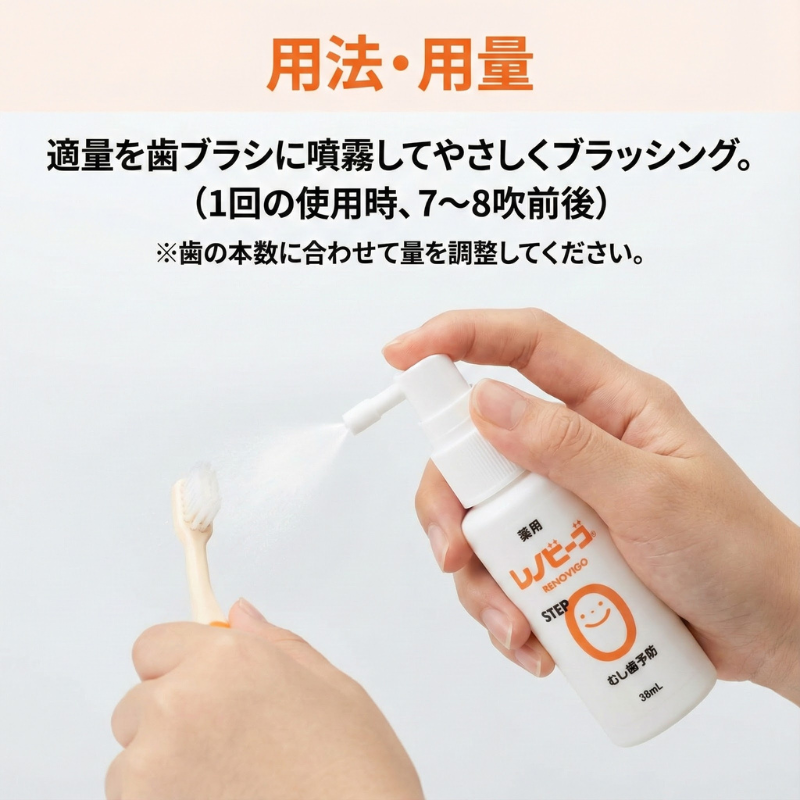 「レノビーゴSTEP0」は、最初の乳歯が生えてきたその日から始められる、むし歯予防フッ素スプレーです。