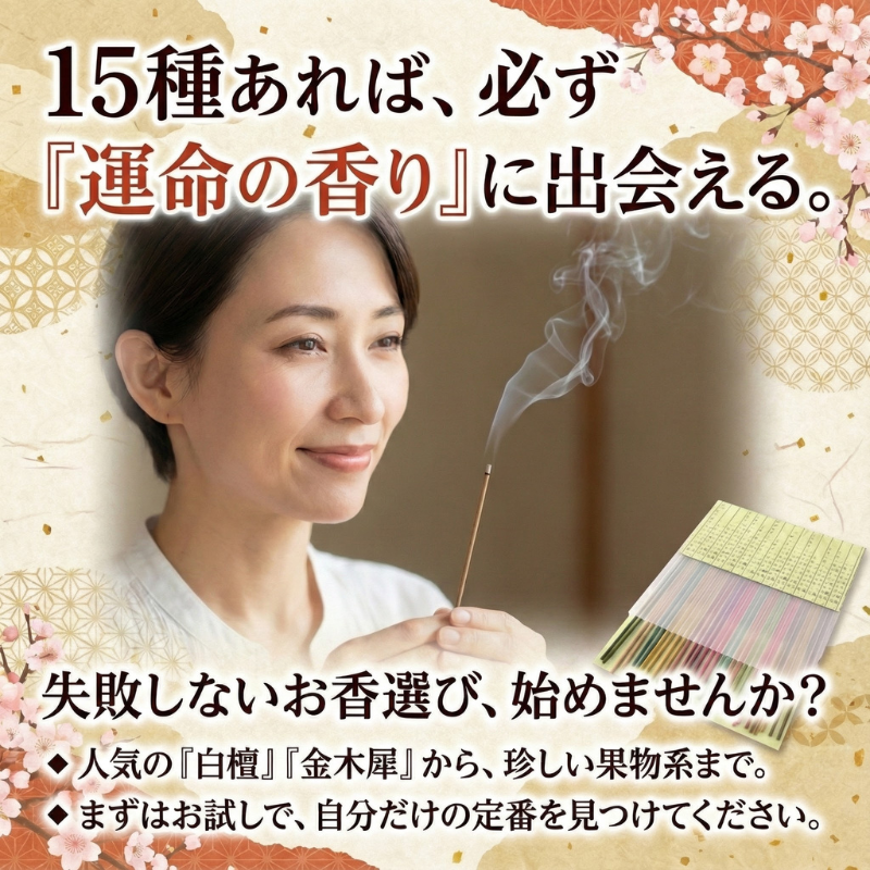 お香 お試しセット かゆらぎ アソート 15種 30本 日本香堂 インセンス スティック 白檀 沈香 金木犀 桜 日本製