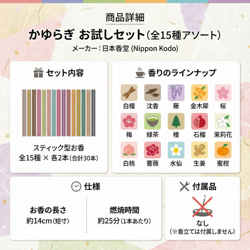 アソート内容 沈香、白檀、檜、桜、水仙、白桃、茉莉花、薔薇、藤、石榴、蜜柑、金木犀、緑茶、生姜、梅
