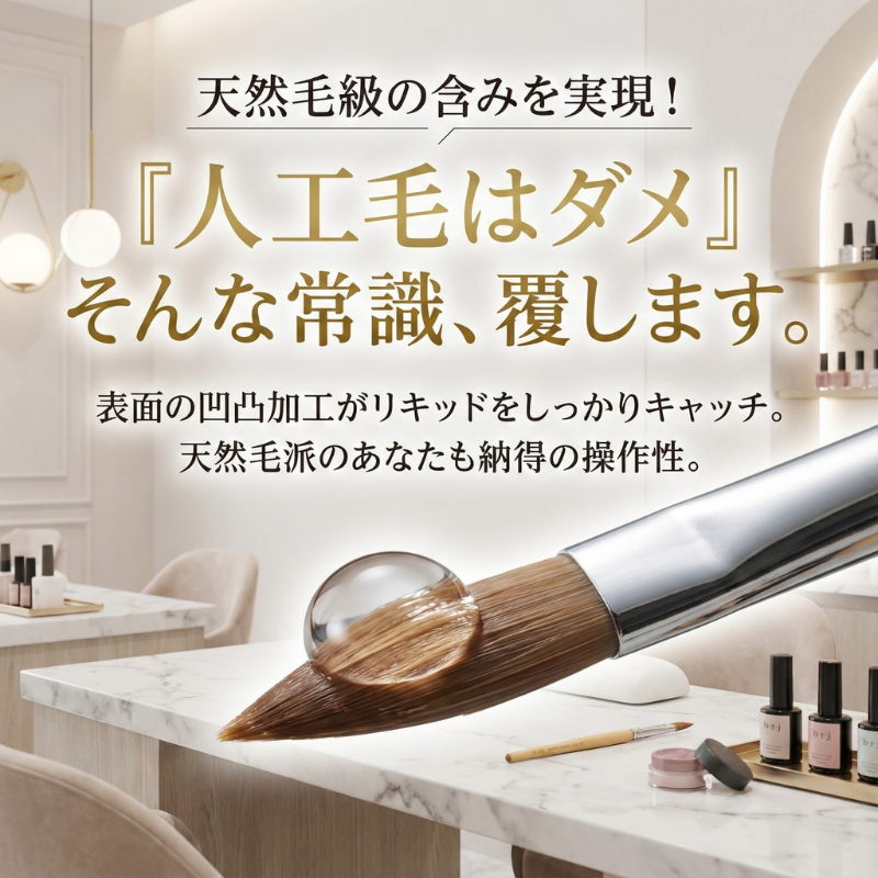 一番の特徴は、天然毛のキューティクルを再現した特殊なPBT繊維です。これにより、アクリルリキッドの含みが格段に向上。思い通りのサイズのミクスチュア(ボール)を取りやすく、スムーズなアプリケーションを可能にします。