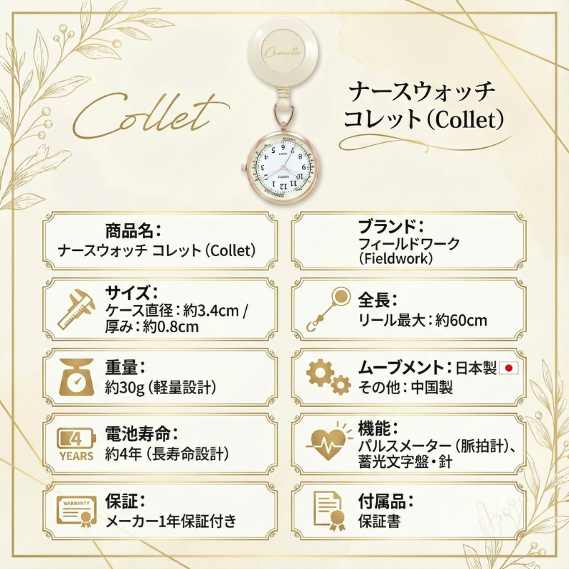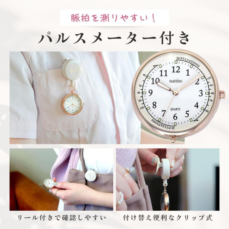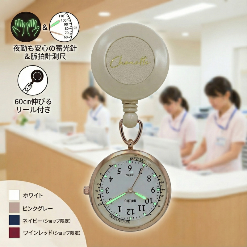 ナースウォッチ コレット フィールドワーク 懐中時計 リール式 パルスメーター 蓄光 看護師 介護士 4年電池 日本製ムーブメント 1年保証